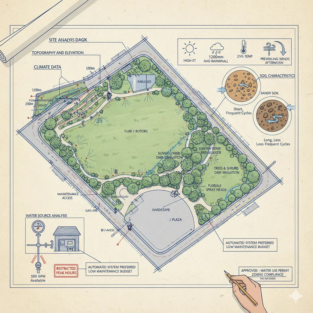 Comprehensive planning includes zone mapping, equipment selection, sensor placement, and integration with existing landscape features or new construction.